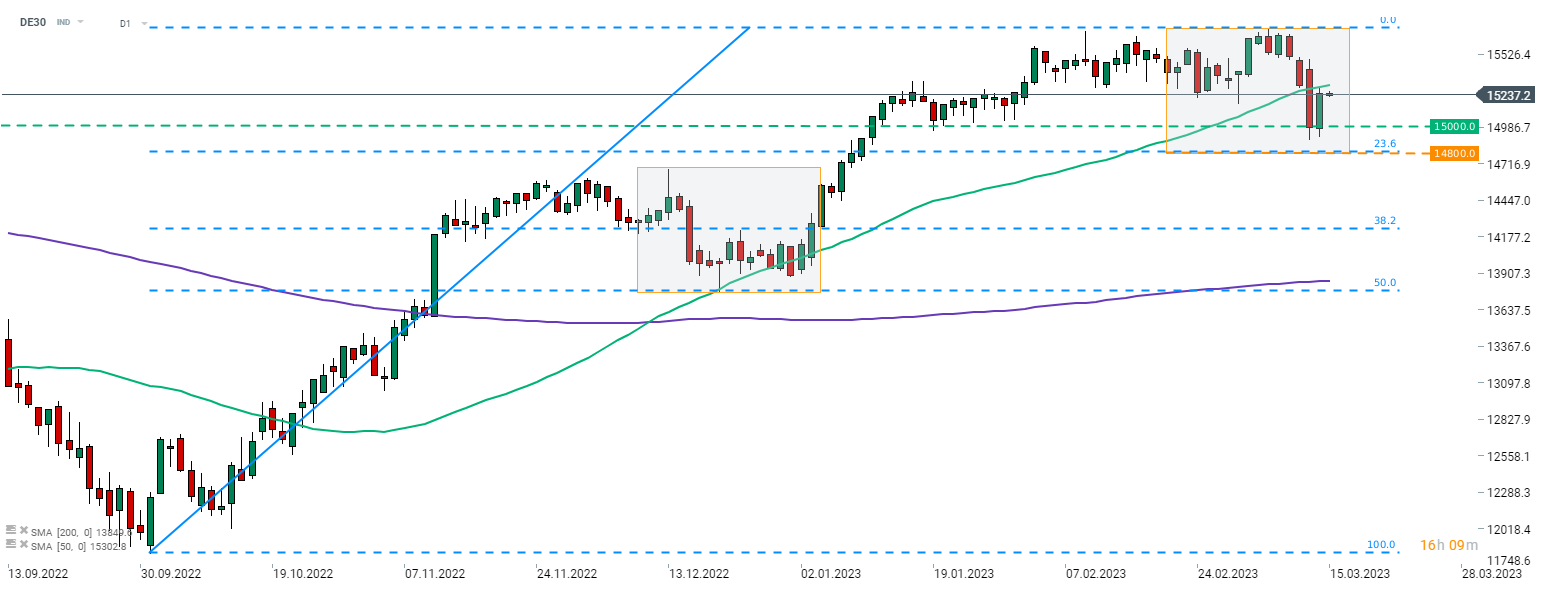 I futures DAX (DE30) sono più o meno invariati prima dell'apertura della sessione cash europea. L'indice tedesco è riuscito a difendere un'area psicologica di 15.000 punti ea lanciare una mossa di recupero. La media mobile a 50 sessioni (linea verde) nei 15.300 punti è una resistenza importante a breve termine da tenere d'occhio ora. Fonte: xStation5