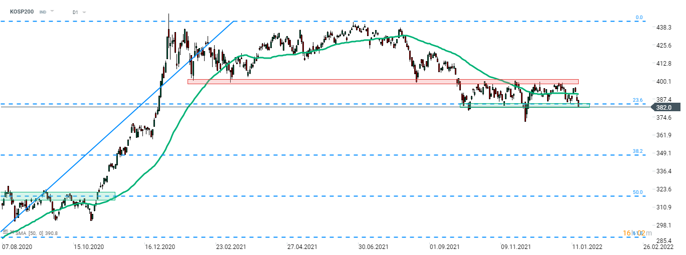 KOSPI (KOSP200) è stato oggi il peggiore tra gli indici asiatici. L'indice è sceso di oltre l'1% e potrebbe superare la zona di supporto al 23,6% del ritracciamento della ripresa post-pandemia che funge da limite inferiore dell'attuale trading range (area 382). Fonte: xStation5