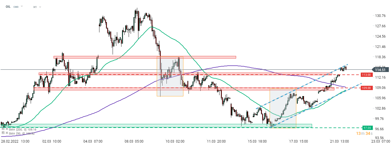 Il Brent (OIL) è riuscito a superare il limite superiore della geometria di mercato nell'area di $ 109 al barile. Il movimento al rialzo è stato esteso in seguito e il prezzo ha anche superato la resistenza di $ 113. Il limite superiore del canale al rialzo nell'area di $ 115 è in fase di test al momento della stampa. Fonte: xStation5