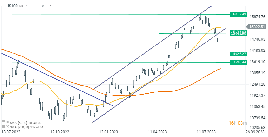 Dopo i forti aumenti di ieri, l'US100 ha nuovamente superato la linea di supporto del trend rialzista recentemente superata. I buoni risultati di Nvidia probabilmente sosterranno l'indice oggi e potrebbero continuare ulteriori aumenti.