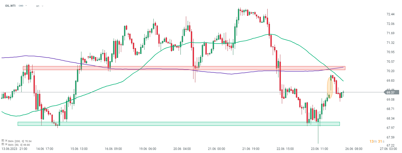 OIL.WTI ha aperto in rialzo dopo un colpo di stato russo di breve durata, ma tutti i guadagni sono già stati cancellati. Fonte: xStation5