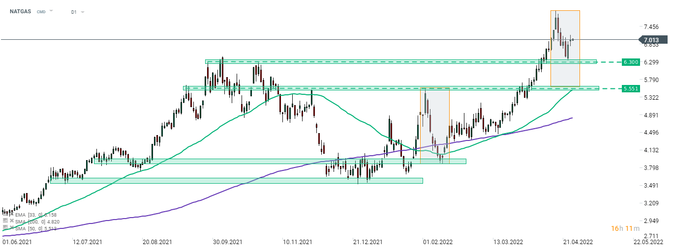 I prezzi del gas naturale europeo sono saliti ieri dopo la notizia che la Russia fermerà le esportazioni del suo gas naturale a 3 paesi europei a causa del mancato regolamento dei pagamenti in rubli. Tuttavia, i prezzi statunitensi (NATGAS) hanno registrato movimenti piuttosto limitati. Finora non ci sono indicazioni che la Russia abbia effettivamente interrotto la fornitura di gas naturale. Tuttavia, potrebbe accadere nel corso della giornata e il gas naturale è un mercato da tenere d'occhio. Fonte: xStation5