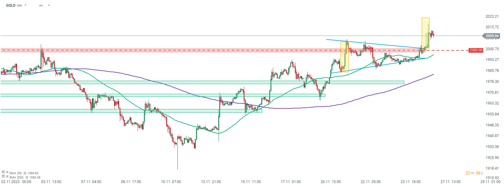 L'ORO è riuscito a superare l'area psicologica dei 2.000 dollari e il limite superiore di un modello triangolare a breve termine. Fonte: xStation5