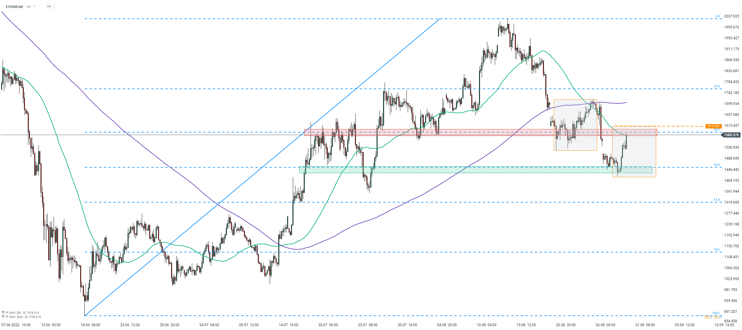 Le criptovalute stanno cercando di riprendersi dai recenti ribassi. Ethereum si sta avvicinando a una zona di resistenza chiave a breve termine nell'area di $ 1.600, contrassegnata da precedenti reazioni ai prezzi e dalla media mobile a 50 periodi (linea verde). Si noti che il limite superiore della geometria del mercato locale si trova appena al di sopra della suddetta zona. Fonte: xStation5