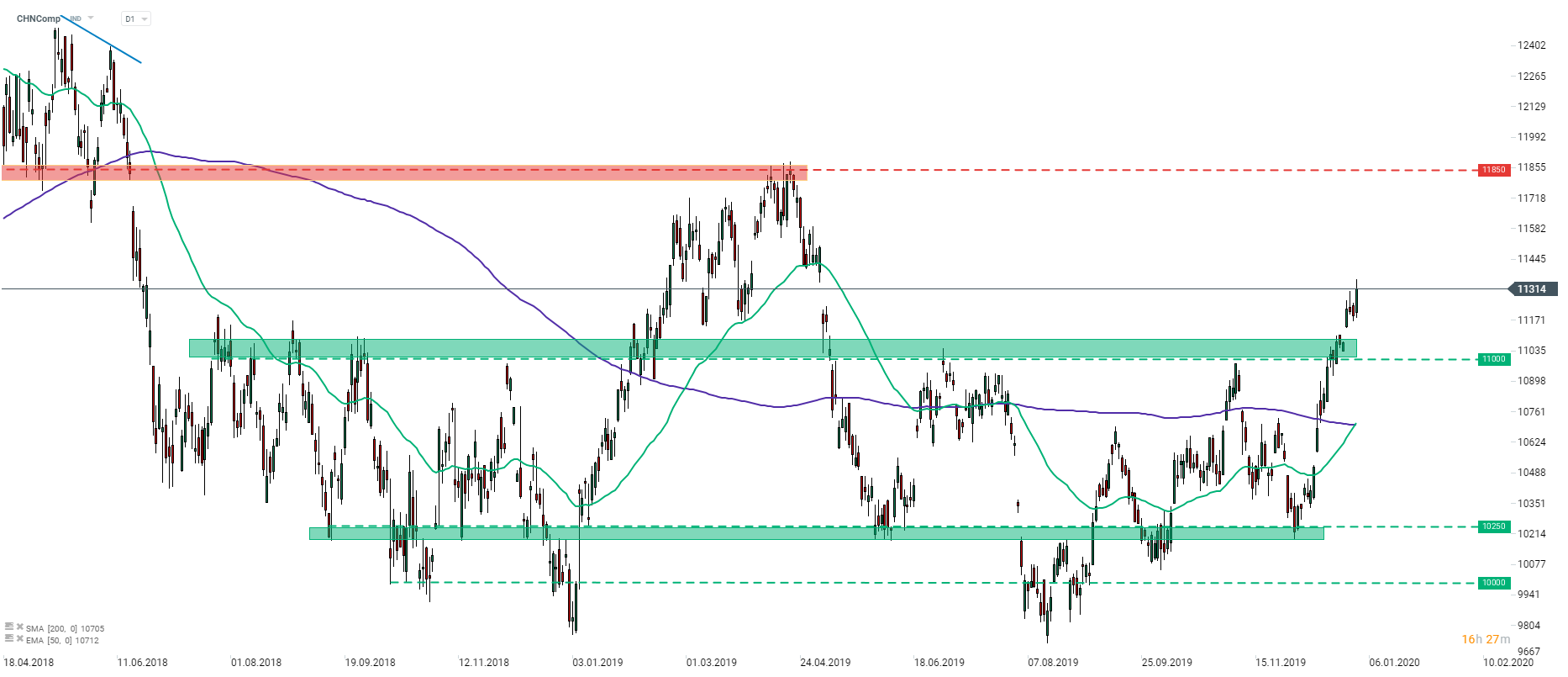 I rally dell'indice cinese (CHNComp) oggi sono spinti dall'impegno della PBOC. La mossa della Banca potrebbe aiutare la seconda economia del mondo a mantenere una crescita nel 2020 superiore al 6%. La prima grande resistenza per l'indice è contrassegnata dai picchi del 2019 (area 11850). Fonte: xStation5