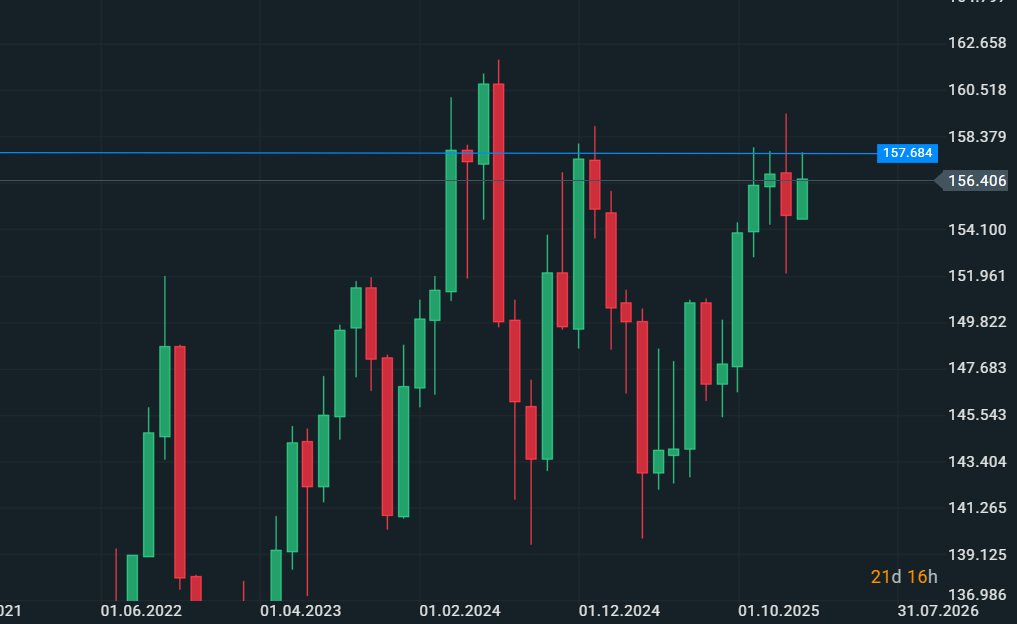 Grafico Mensile di UsdJpy e la vendita dei massimi degli scorsi mesi in area 157 - Fonte: XStation