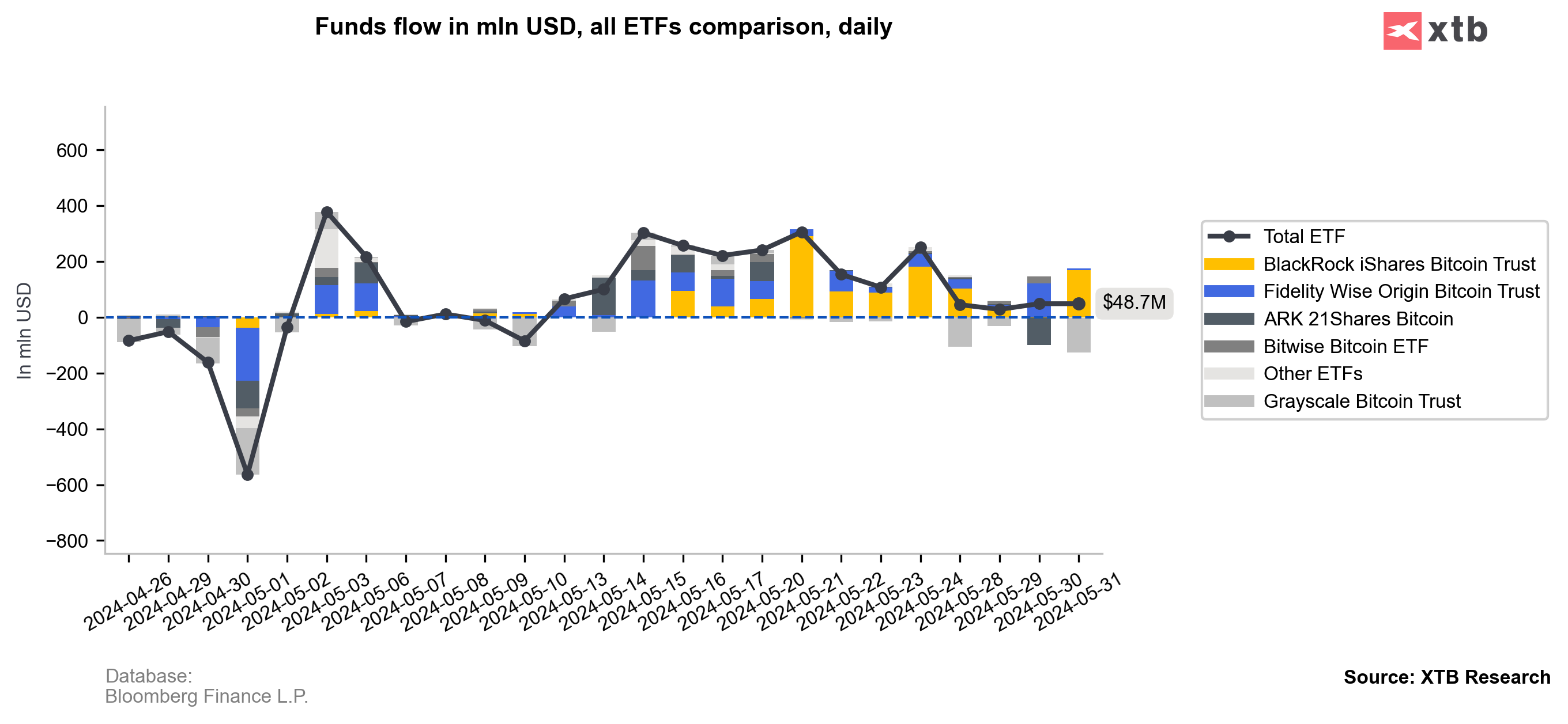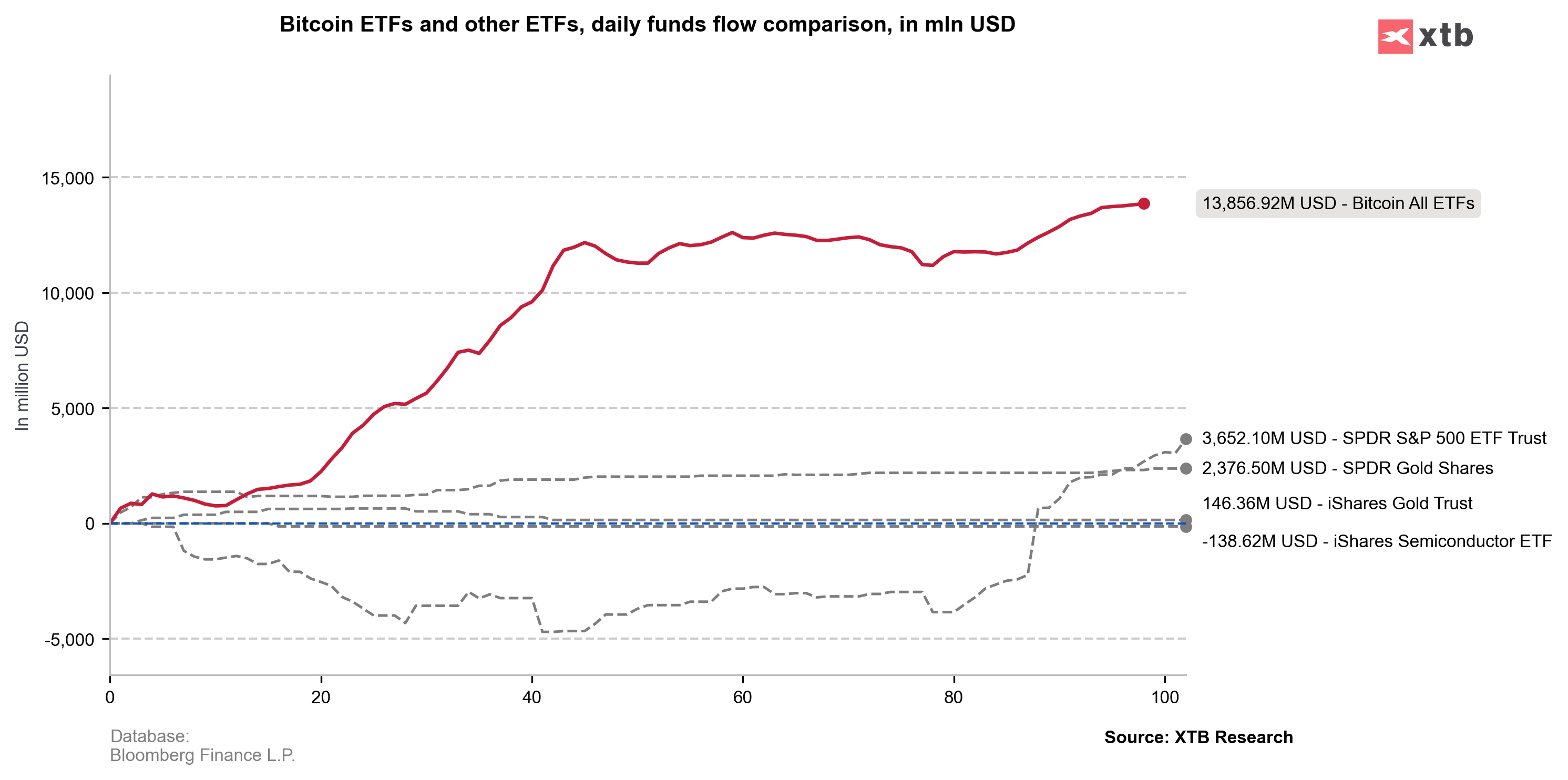Sei mesi dopo il lancio degli ETF spot su BTC, quasi 14 miliardi di dollari sono già confluiti in veicoli di acquisto di Bitcoin negoziati in borsa; molte volte di più rispetto ai fondi SPDR "tradizionali" per l'S&P 500 o ai semiconduttori. Il comportamento a lungo termine dei fondi che detengono quantità significative di BTC potrebbe ridurre l’offerta e portare a uno shock dell’offerta o, al contrario, portare il mercato in fasi di panico più profonde se gli investitori iniziassero a vendere azioni in massa. Fonte: XTB Research, Bloomberg Finance LP