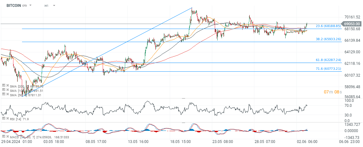 Osservando l'intervallo orario, vediamo che il prezzo di BTC ha superato le importantissime medie mobili (SMA200, SMA100, SMA50) e il ritracciamento di Fibonacci di 23,6 dell'onda ascendente di aprile/maggio. Il principale obiettivo rialzista a medio termine sono i livelli intorno ai 75.000 dollari, ma un supporto importante si trova anche a 70.000 e 72.000 dollari per BTC, dove i recenti aumenti sono stati fermati.