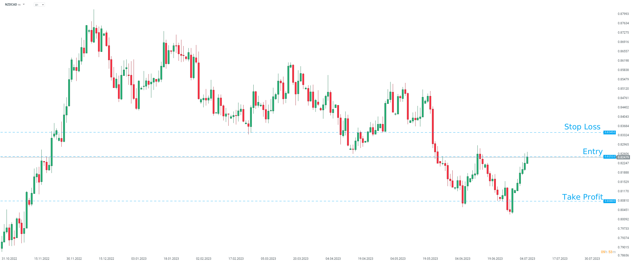 ANZ consiglia di aprire una posizione Short su NZDCAD al prezzo di mercato con un obiettivo di 0,8080 e un ordine di stop loss collocato a 0,8345. Fonte: xStation5