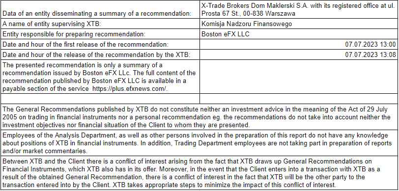 Questo materiale è una comunicazione di marketing ai sensi dell'Art. 24, paragrafo 3, della direttiva 2014/65 / UE del Parlamento europeo e del Consiglio, del 15 maggio 2014, relativa ai mercati degli strumenti finanziari e che modifica la direttiva 2002/92 / CE e la direttiva 2011/61 / UE (MiFID II). La comunicazione di marketing non è una raccomandazione di investimento o informazioni che raccomandano o suggeriscono una strategia di investimento ai sensi del regolamento (UE) n. 596/2014 del Parlamento europeo e del Consiglio, del 16 aprile 2014, relativo agli abusi di mercato (regolamento sugli abusi di mercato) e che abroga la direttiva 2003/6 / CE del Parlamento europeo e del Consiglio e direttive della Commissione 2003/124 / CE, 2003/125 / CE e 2004/72 / CE e regolamento delegato (UE) 2016/958 della Commissione, del 9 marzo 2016, che integra il regolamento UE) n. 596/2014 del Parlamento europeo e del Consiglio per quanto riguarda le norme tecniche di regolamentazione per le disposizioni tecniche per la presentazione obiettiva di raccomandazioni di investimento o altre informazioni che raccomandano o suggeriscono una strategia di investimento e per la divulgazione di particolari interessi o indicazioni di conflitti di interessi o qualsiasi altra consulenza, anche nell'ambito della consulenza sugli investimenti, ai sensi della legge sugli strumenti finanziari del 29 luglio 2005 (ad es. Journal of Laws 2019, voce 875, come modificata). La comunicazione di marketing è preparata con la massima diligenza, obiettività, presenta i fatti noti all'autore alla data di preparazione ed è priva di elementi di valutazione. La comunicazione di marketing viene preparata senza considerare le esigenze del cliente, la sua situazione finanziaria individuale e non presenta alcuna strategia di investimento in alcun modo. La comunicazione di marketing non costituisce un'offerta di vendita, offerta, abbonamento, invito all'acquisto, pubblicità o promozione di strumenti finanziari. XTB S.A. non è responsabile per eventuali azioni o omissioni del cliente, in particolare per l'acquisizione o la cessione di strumenti finanziari. XTB non si assume alcuna responsabilità per qualsiasi perdita o danno, anche senza limitazione, eventuali perdite, che possono insorgere direttamente o indirettamente, intrapresa sulla base delle informazioni contenute in questa comunicazione di marketing. Nel caso in cui la comunicazione di marketing contenga informazioni su eventuali risultati relativi agli strumenti finanziari ivi indicati, questi non costituiscono alcuna garanzia o previsione relativa ai risultati futuri. Le prestazioni passate non sono necessariamente indicative dei risultati futuri, e chiunque agisca su queste informazioni lo fa interamente a proprio rischio.