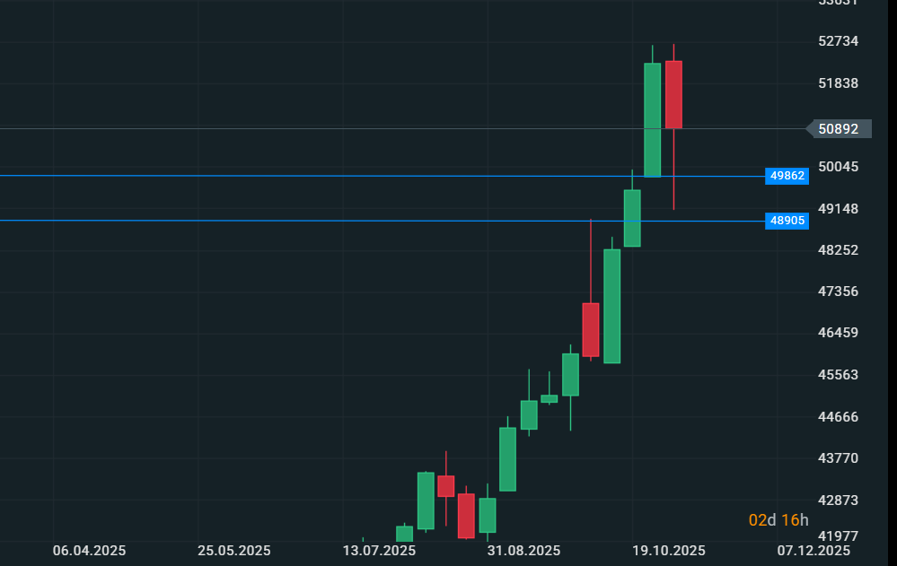 Mercati molto tecnici, ora provano a vendere i massimi delle scorse settimane e vanno testare livelli minimi/massimi su base giornaliera/settimanale. Possiamo fare l'esempio del Nasdaq che é andato di fatto a rompere i minimi della scorsa settimana per poi poggiarsi sui massimi della settimana del 6 ottobre, un movimento altamente tecnico che non di certo é frutto di uscita di dati, questi ultimi fermi per via dello shutdown. Il Nikkei oggi é in forte ripresa sul cash con un rialzo dell'1,4%, anch'esso é andato a testare dei minimi, quella della scorsa settimana. In sostanza vediamo dei mercati che sono molto tecnici, che vanno avanti per inerzia, non si trovano dei catalyst nel breve periodo che possano smuovere la situazione o proseguire i picchi di volatilitá. L'attesa per la fine dello shutdown é oramai palese, alcuni parlano di fine shutdown entro la prima metá di novembre, ma al momento non abbiamo alcun segnale che ci possa suggerire questo.