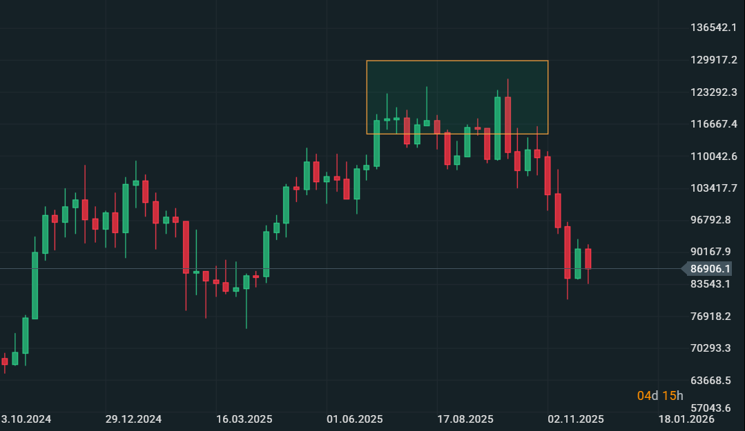 Grafico di Bitcoin su base settimanale. In evidenza l'area dei massimi venduti - Fonte: XStation - Studio: David Pascucci, XTB