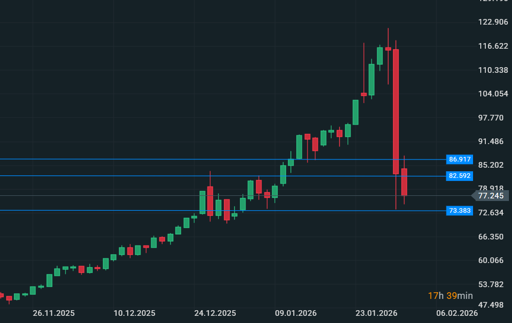 Abbiamo assistito ad un fortissimo calo per oro e argento nel corso della giornata di venerdí, ribassi che hanno di fatto annullato settimane di rialzi in un solo giorno. La ragione é prettamente tecnica e risiede nelle contrattazioni dei futures e nella loro natura, ossia le chiusure a margine. In presenza di alta volatilitá sui massimi, i compratori e i venditori iniziano a fare fatica ad incontrarsi su livelli di prezzo vicini, creando dei veri e propri vuoti di mercato che spingono ad esecuzioni di "ordini a mercato" su livelli di prezzo distanti generando la volatilitá che abbiamo visto in queste ultime settimane. Nella giornata di venerdí abbiamo peró assistito ad un'ondata di vendite, inizialmente fisiologica, che ha innescato un vero e proprio effetto a cascata, simile ad un flash crash ma in questo caso prolungato. Le vendite, avvenute con esecuzioni a mercato, hanno innescato una corsa dei prezzi al ribasso esasperando la volatilitá, la stessa che ha poi bruciato parte o in tutto i margini sui contratti derivati (futures e/o opzioni). Questo ribasso quindi é di natura tecnica, la dinamica di lungo inizia a risultare compromessa su base settimanale ma ancora non sulla dinamica mensile. Non si escludono ritorni verso l'alto dei prezzi, anche se ben al di sotto dei massimi visti la scorsa settimana. Probabilmente potremmo iniziare a considerare i massimi visti di recente come massimi che potremmo non rivedere per molto tempo. Situazione da monitorare di settimana in settimana.