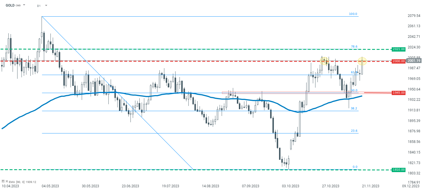 Le quotazioni dell'oro hanno approfittato della recente debolezza del dollaro USA e sono salite sopra la barriera dei 2.000 dollari. Tuttavia, va notato che l'area intorno a questo livello rotondo è stata una resistenza chiave, da dove è iniziata una forte correzione al ribasso a fine ottobre, raggiungendo quasi i 100 dollari. Se la storia dovesse ripetersi, il potenziale range per un pullback sarebbe intorno al livello di 1945 dollari, dove si trovano le precedenti reazioni dei prezzi e la media EMA100. D'altra parte, in caso di violazione prolungata del livello di 2.000 dollari, i rialzi potrebbero raggiungere la resistenza a 2021 dollari. Questo luogo è dovuto alla posizione del 78,6% di ritracciamento di Fibonacci dell'intera onda discendente a partire dai picchi di maggio di quest'anno.