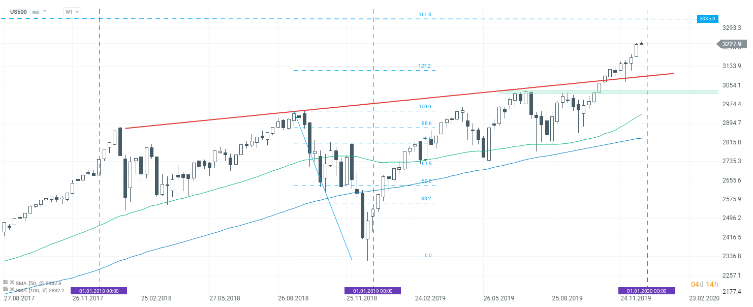 Dando un'occhiata all'indice sul frame settimanale, si può vedere che l'indice è precipitato dopo aver raggiunto il massimo storico nel settembre 2018. I ribassisti hanno continuato a fare pressione sull'indice fino all'ultima settimana del 2018 quando i rialzisti hanno ripreso il controllo. La tendenza al rialzo dell'indice ha subito un'accelerazione a gennaio 2019. L'indice è stato nuovamente scambiato ai massimi storici entro la fine di aprile. Nei due mesi precedenti, l'US500 ha continuato a raggiungere nuovi massimi record quasi ogni settimana. Dopo una pausa sopra la linea segnata dai massimi locali, il movimento verso l'alto ha accelerato. Questa linea (contrassegnata con un colore rosso sul grafico) agisce come il supporto più vicino ora. Il livello di resistenza più vicino da osservare è di 3335 punti: il 161,8% del ritracciamento esterno della correzione al ribasso di fine 2018.
