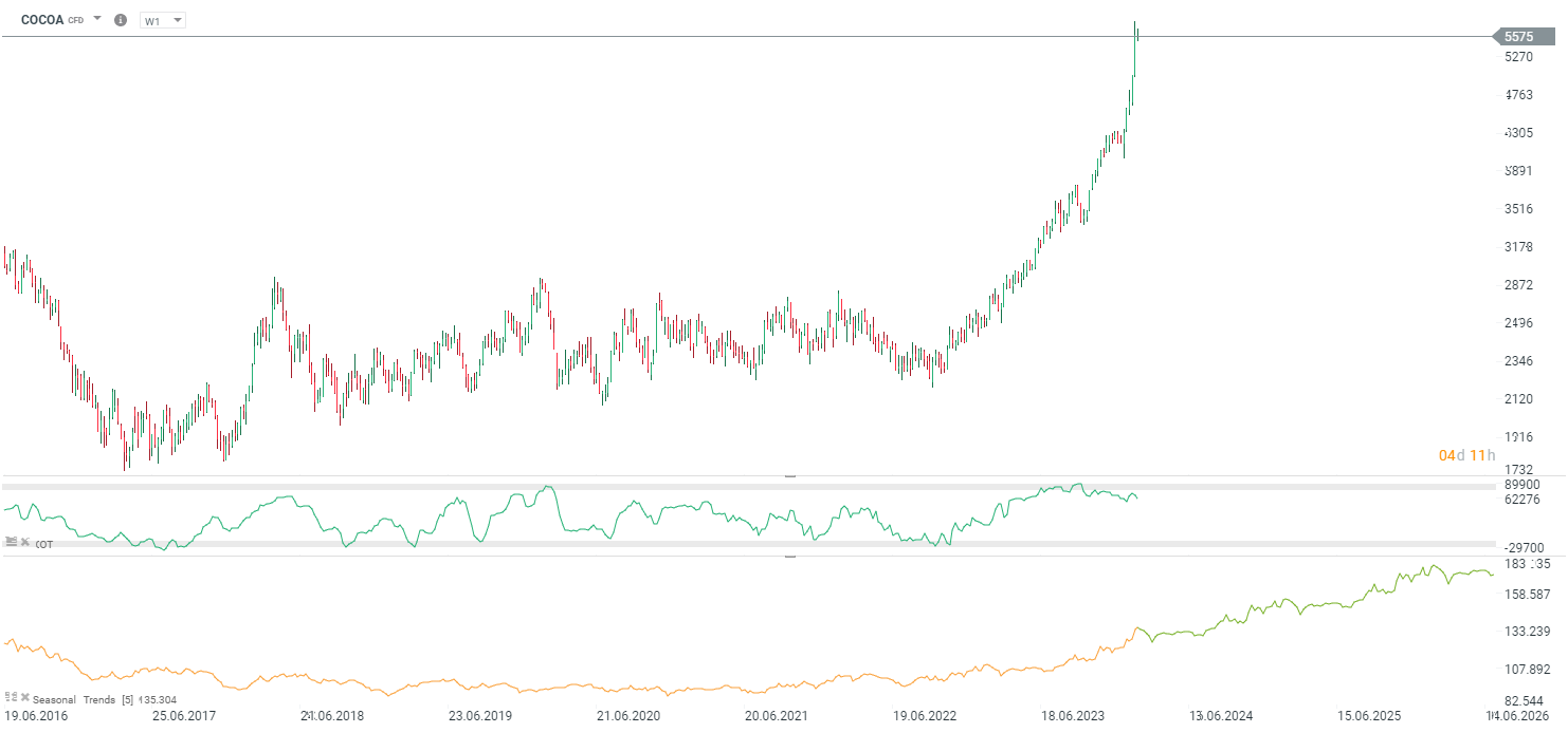 Il prezzo del cacao inizia a stabilizzarsi. I modelli stagionali suggeriscono la possibilità di una correzione al ribasso fino a metà marzo. D’altro canto, la riduzione del posizionamento netto non sta procedendo come avvenuto durante le precedenti ampie correzioni. Fonte: xStation5