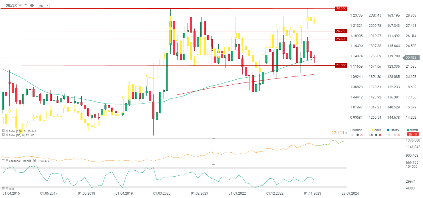 Il prezzo dell’argento rimane al di sopra del supporto chiave, il che fa ben sperare per il potenziale rimbalzo dei prezzi nella seconda parte dell’anno. Fonte: xStation5