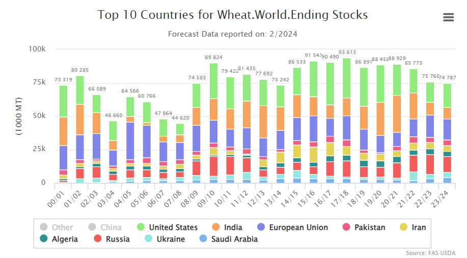 - L’ultimo rapporto WASDE (World Agricultural Supply and Demand Estimates) ha mostrato un netto aumento delle scorte finali di grano per la stagione 23/24, raggiungendo 658 milioni di bushel, rispetto al livello precedente di 648 milioni di bushel