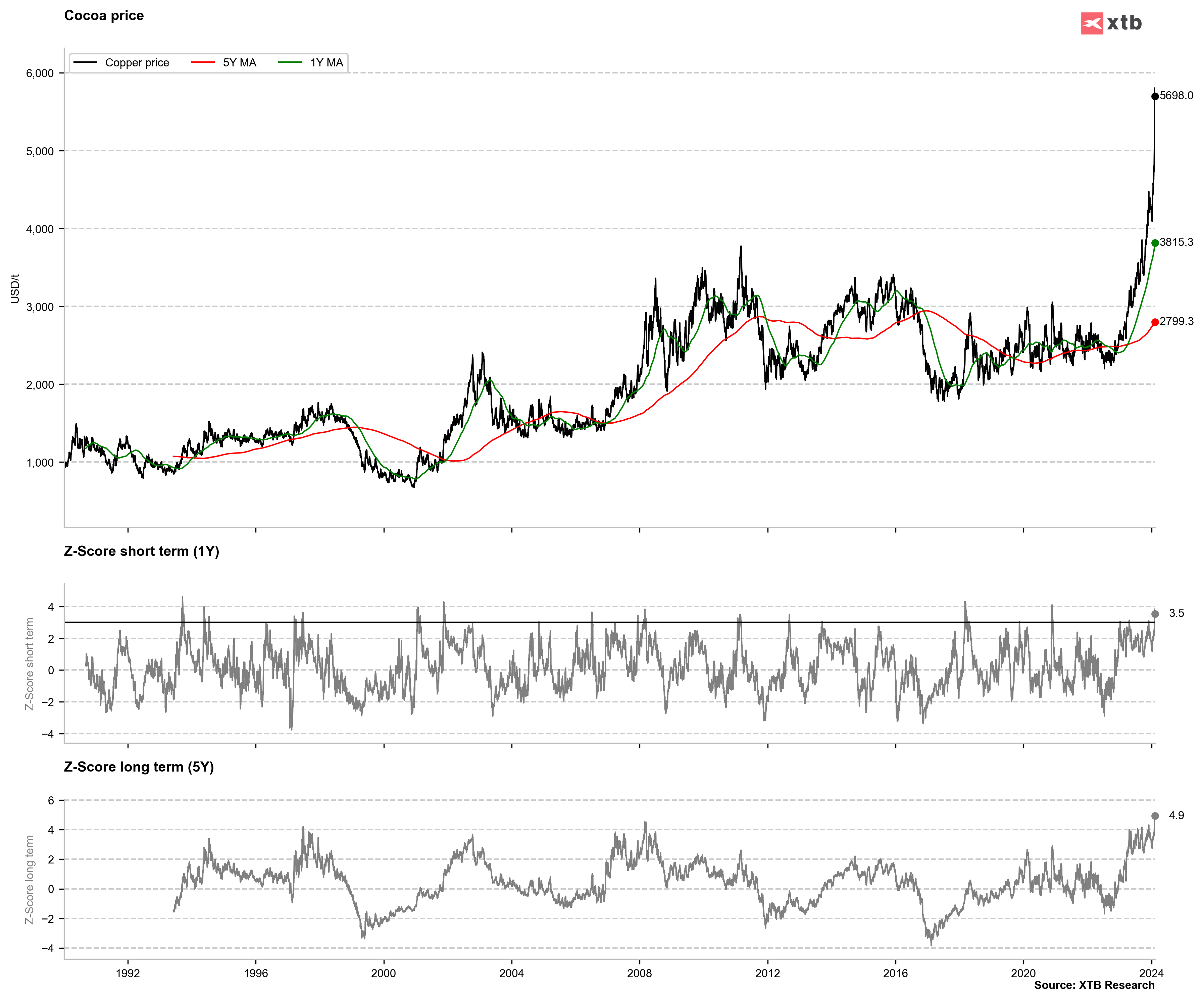 Dando uno sguardo ai prezzi negli ultimi 30 anni, possiamo vedere che spesso si sono verificate correzioni dopo che il prezzo ha deviato di 4 deviazioni standard al di sopra della media di 1 anno. Tuttavia, i prezzi si sono discostati fino a 5 deviazioni standard rispetto alla media quinquennale. Fonte: Bloomberg Finance LP, XTB Research