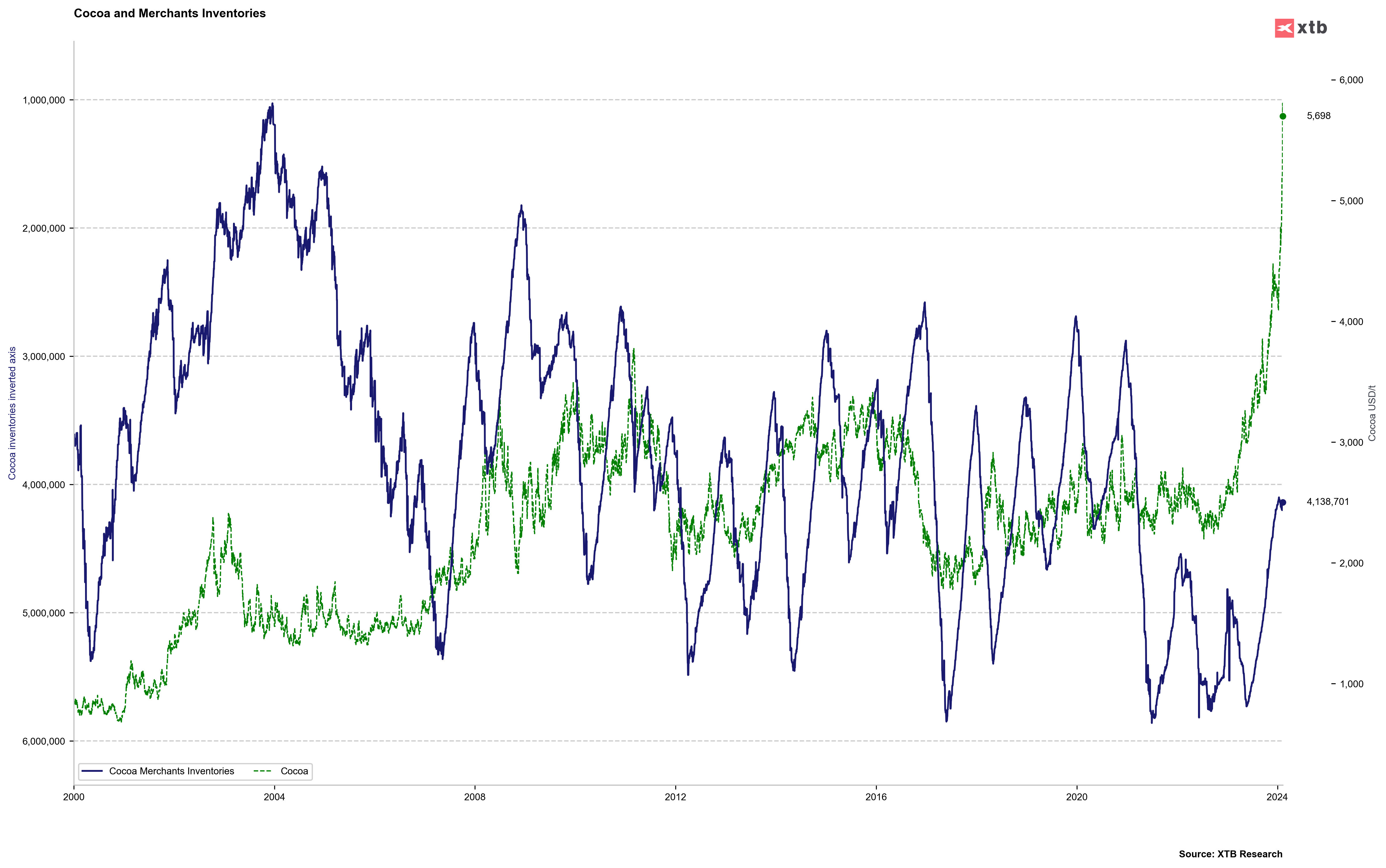 Le scorte dei commercianti rimangono a livelli bassi, ma non così estremamente bassi come nel 2003 o nel periodo 2008-2016. Finora gli aumenti dei prezzi sono stati piuttosto limitati, ma se il calo delle scorte dovesse accelerare, i prezzi del cacao potrebbero aumentare. Fonte: Bloomberg Finance LP, XTB Research