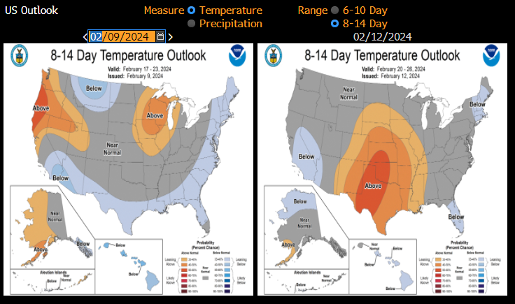 - Le previsioni meteorologiche indicano temperature vicine alla media nel breve termine, con temperature leggermente superiori alla media nella parte centrale degli Stati Uniti continentali