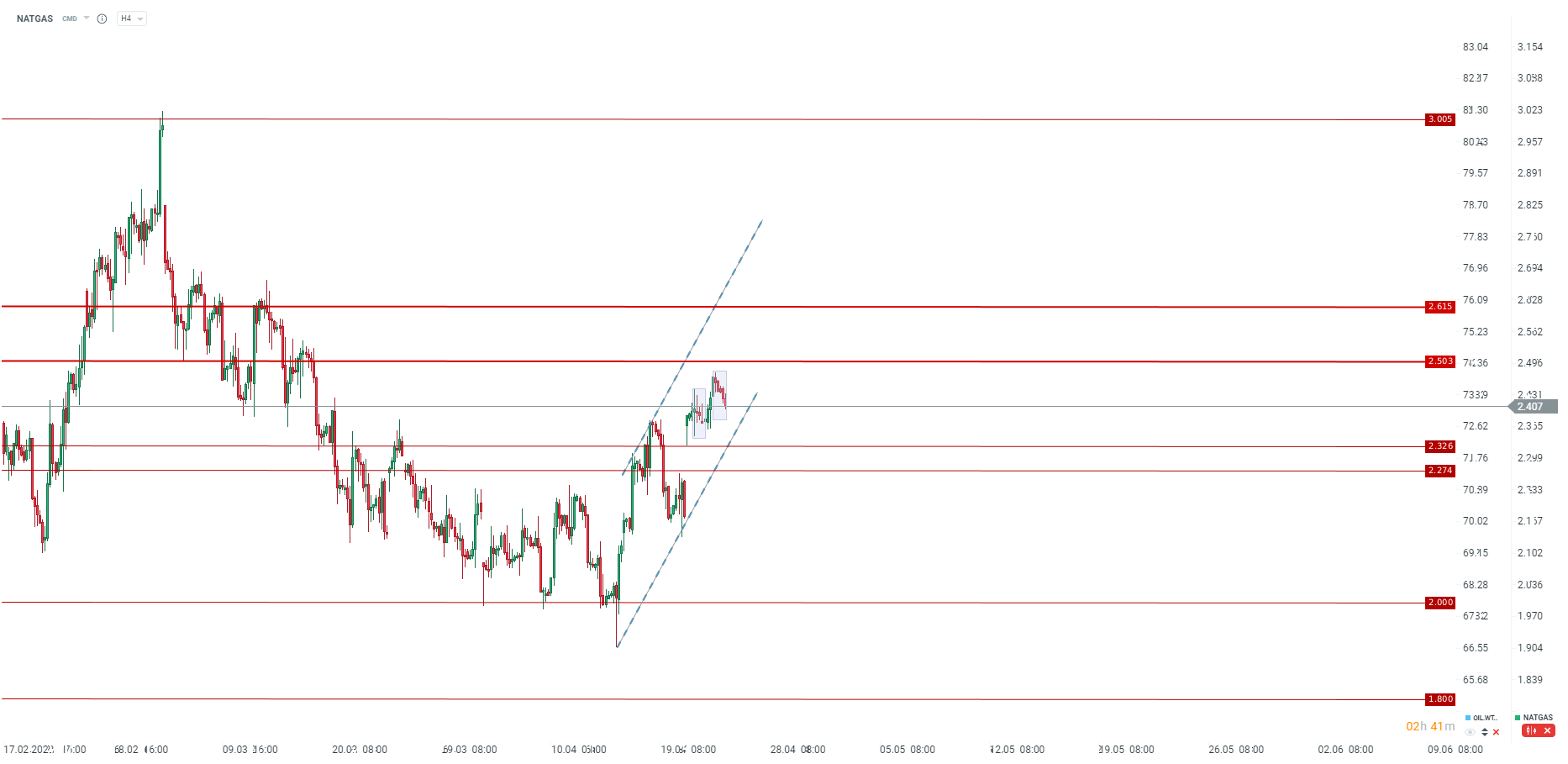Il prezzo è sceso leggermente dai massimi di ieri vicino a $ 2,50 per area MMBTu. Se il prezzo dovesse continuare a scendere e scendere sotto i 2,38$, non si può escludere un tentativo superare il limite inferiore del canale rialzista. Fonte: xStation5