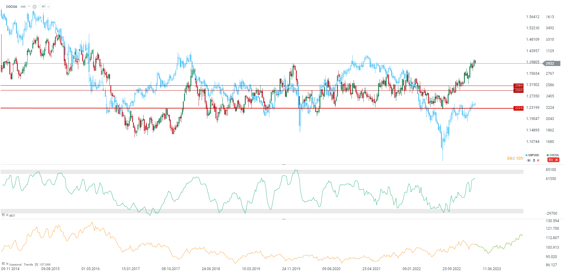 I modelli stagionali mostrano che i continui aumenti di prezzo sul mercato del cacao sono stati estremamente rapidi. Fonte: Bloomberg, XTB