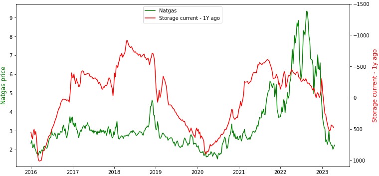 - Potremmo essere pronti per una ripetizione della svolta del 2019 e del 2020, quando gli inventari comparativi sono leggermente diminuiti (asse invertito) ma hanno ripreso a salire in seguito e l'eccesso di offerta comparativa ha raggiunto 800 bcf