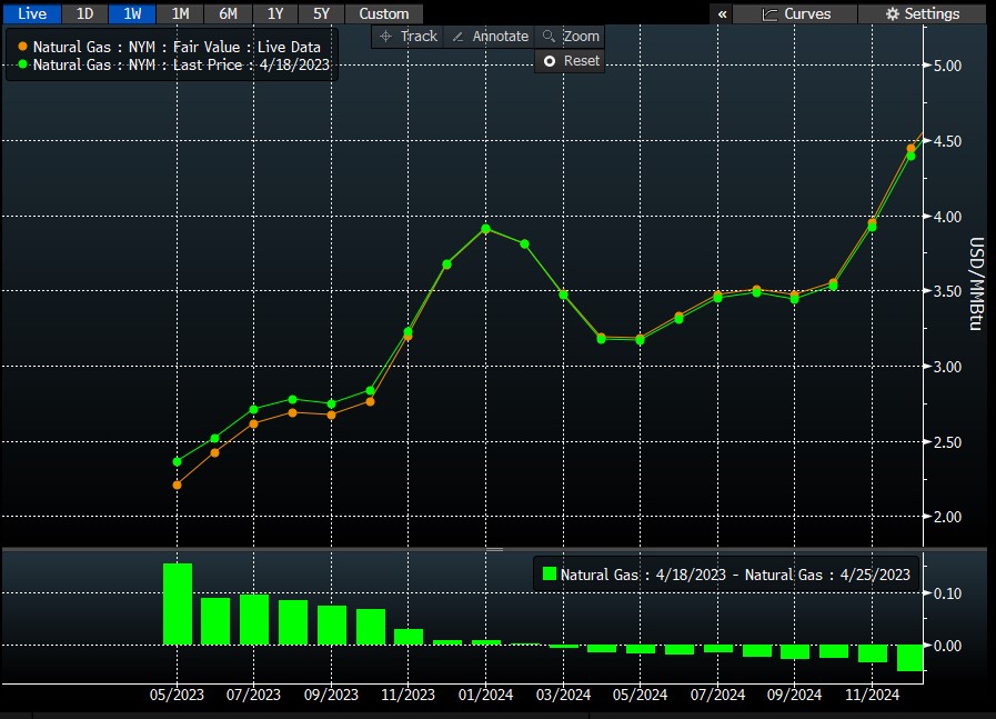 La curva dei future suggerisce un calo della domanda a breve termine di gas naturale. Fonte: Bloomberg