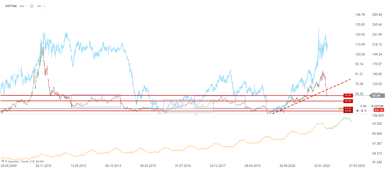 COTTON ha trovato supporto a breve termine nell'area di 96 centesimi per libbra. Tuttavia, un calo al di sotto di questa zona potrebbe portare a un calo di 10-20 centesimi. Va notato che già nel 2011 i prezzi del cotone hanno continuato a diminuire quando i prezzi del petrolio si sono stabilizzati. Fonte: xStation5