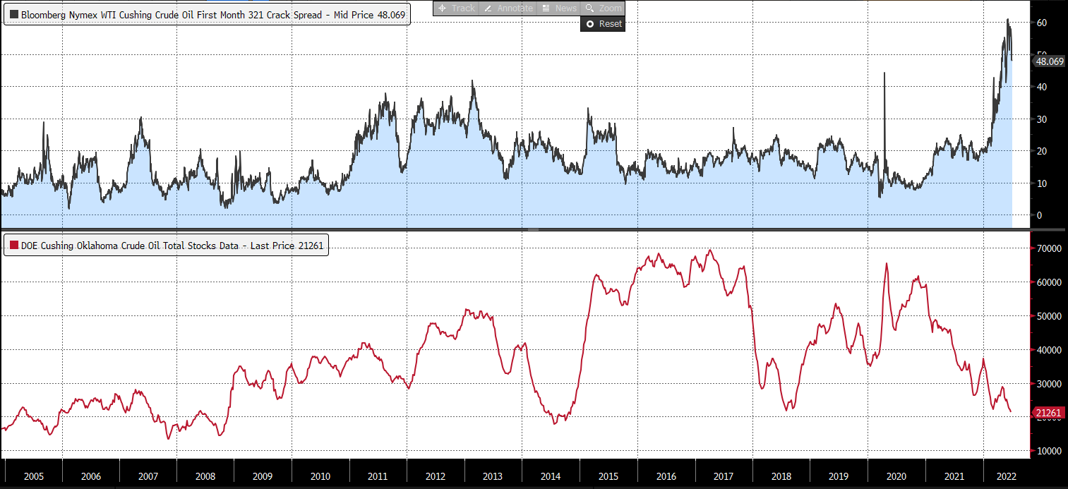 Il crack spread mostra che i margini delle raffinerie di petrolio sono molto elevati. Inoltre, le scorte presso l'hub statunitense di Cushing sono scese a livelli pericolosamente bassi, segnalando che il petrolio non è così disponibile per le raffinerie statunitensi come alcuni potrebbero pensare. Fonte: Bloomberg