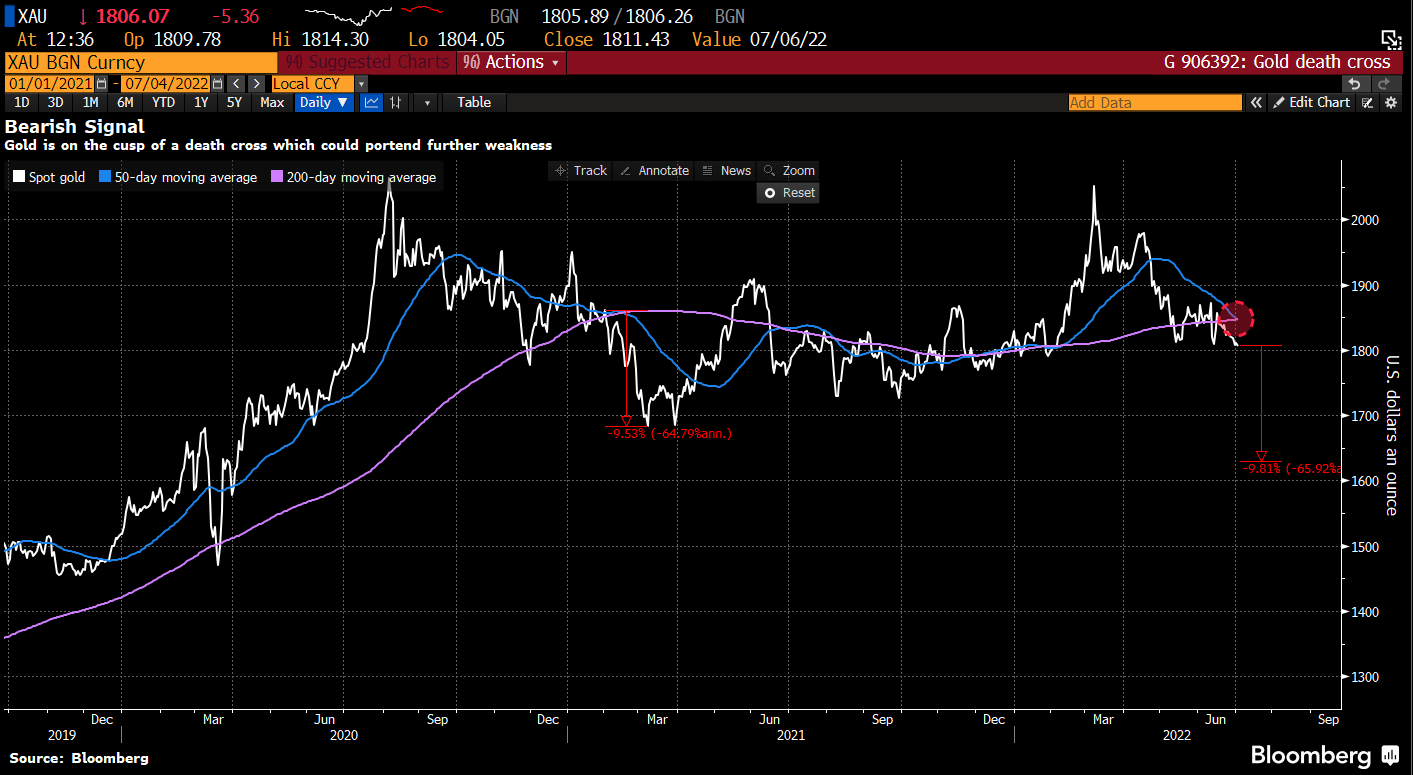 Dando un'occhiata al grafico dell'oro da un punto di vista tecnico, possiamo vedere un forte segnale ribassista - croce della morte - che potrebbe spingere il prezzo a $ 1.600 e interrompere un consolidamento di 2 anni. Fonte: Bloomberg