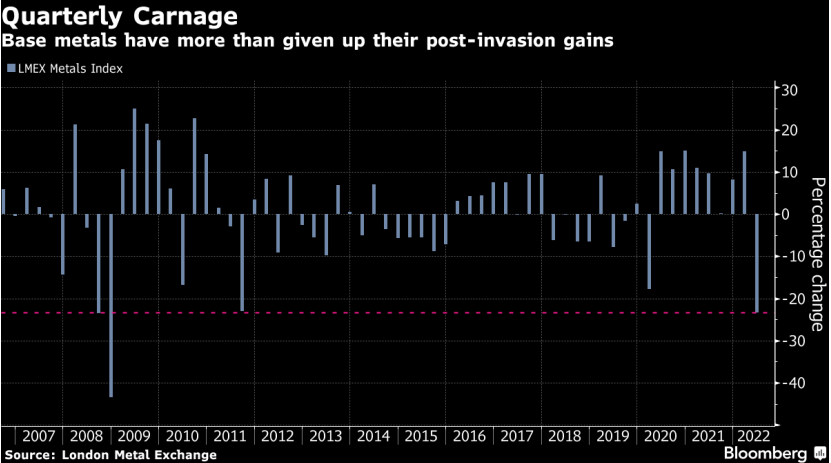 Il mercato dei metalli ha subito un duro colpo nel secondo trimestre del 2022. Fonte: Bloomberg