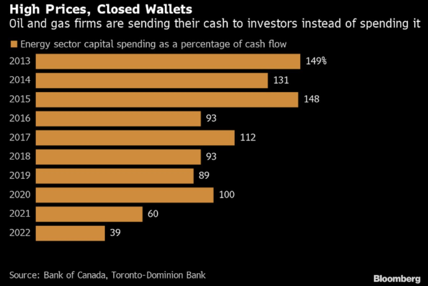 - Nonostante una situazione molto tesa sul mercato del petrolio mondiale, i produttori non aumentano gli investimenti. Il potenziale di investimento è limitato da considerazioni ESG. I dati mostrano che i produttori di petrolio preferiscono distribuire denaro agli azionisti piuttosto che investirlo
