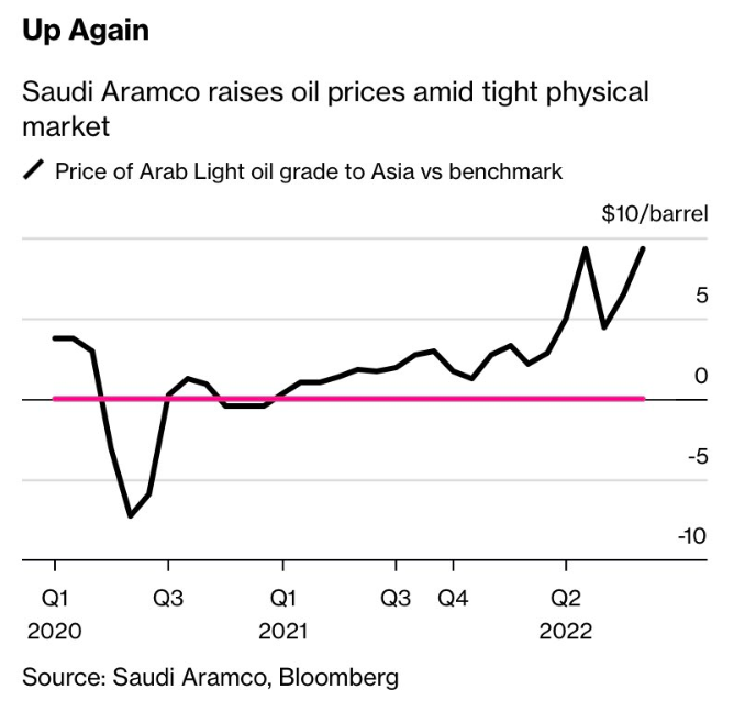 - Gli alti margini di raffineria fanno sì che i produttori aumentino i prezzi. L'Arabia Saudita ha aumentato i prezzi anche se ha aumentato la produzione e la merce in Asia è più disponibile di prima (grazie alle esportazioni di greggio russe reindirizzate lì). L'Arabia Saudita ora addebita ai clienti asiatici un premio di $ 10 rispetto al prezzo di riferimento