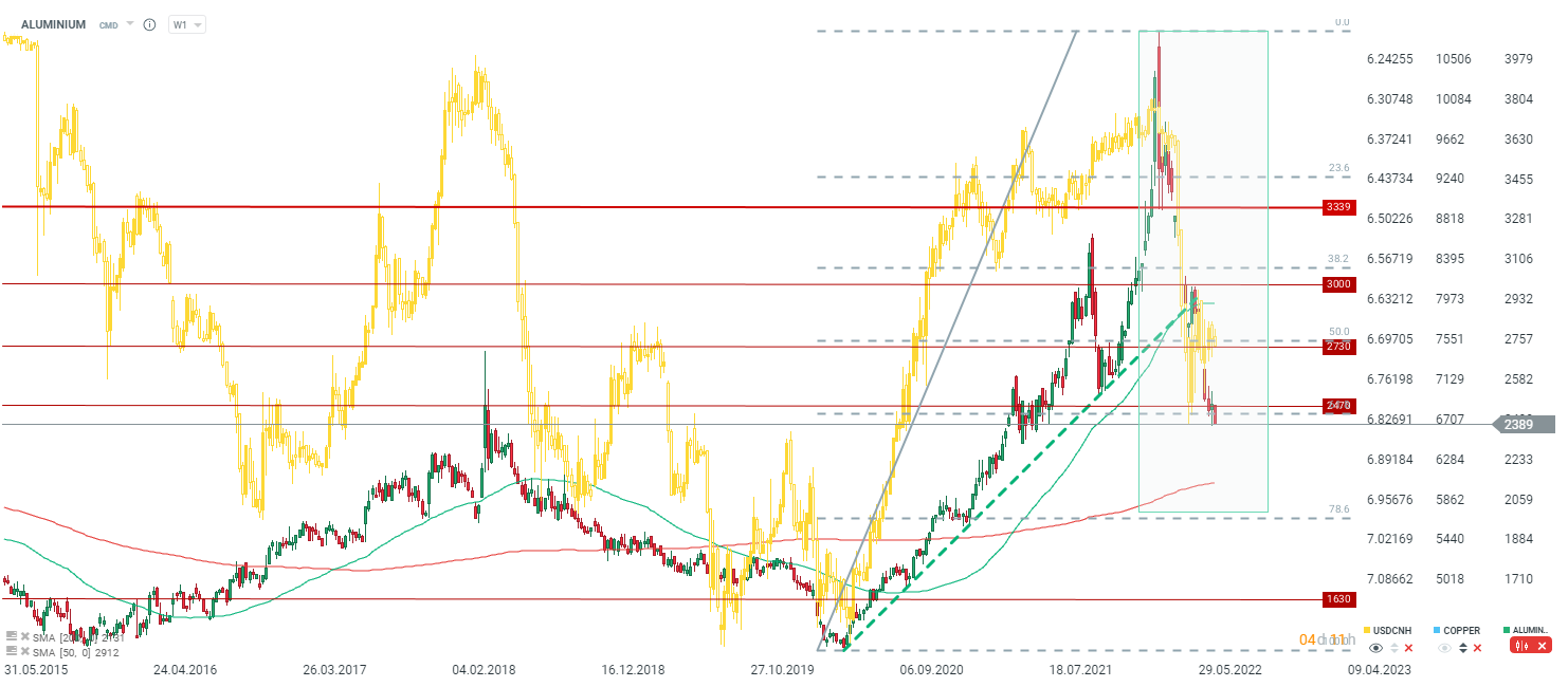 I prezzi dell'alluminio scendono al di sotto dei massimi del 2018 e al di sotto del 61,8%, ritracciando l'ultimo impulso al rialzo. La gamma di ribassi dal 2008, se ripetuta, indicherebbe un calo a $ 2.000. D'altra parte, la stabilizzazione dello yuan potrebbe portare a una stabilizzazione anche su questo mercato. Fonte: xStation5