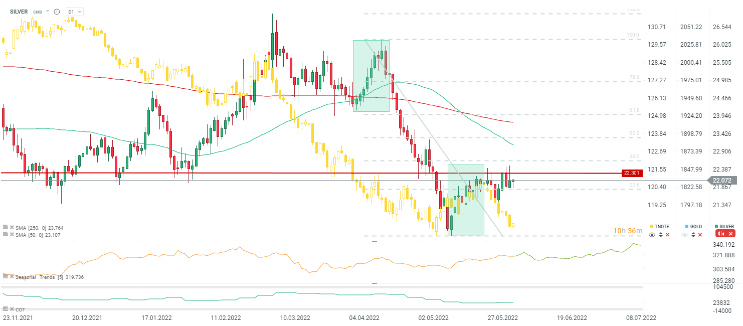 Il prezzo dell'argento si trova vicino a una resistenza chiave di $ 22,30. Fonte: xStation5