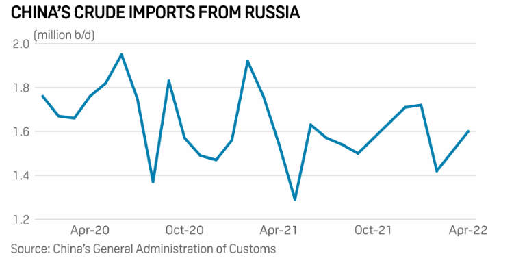 Le importazioni cinesi del petrolio russo sono in ripresa, ma sono ancora lontane dai massimi del 2020. Fonte: S&P Platts