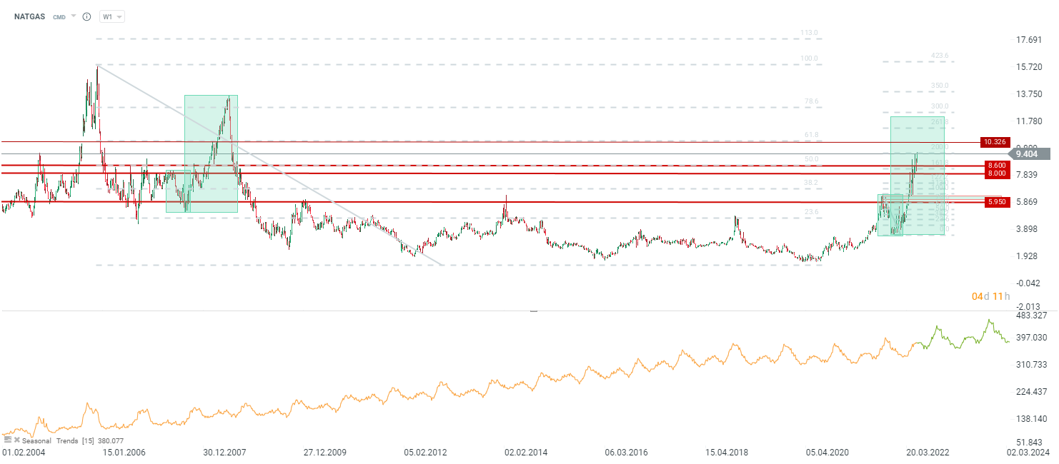 NATGAS si trova vicino alla resistenza di $ 9,50. Nel caso in cui venisse superata, il movimento al rialzo potrebbe estendersi verso l'area 10.00-10.30, dove le reazioni dei prezzi si sono verificate nel 2005 e nel 2008. I modelli stagionali a lungo termine indicano che ci stiamo avvicinando a un massimo locale. Nel frattempo, i modelli stagionali a breve termine suggeriscono che il prezzo potrebbe muoversi lateralmente fino a luglio e quindi lanciare un movimento al rialzo che durerà fino alla fine di ottobre e novembre. Fonte: xStation5