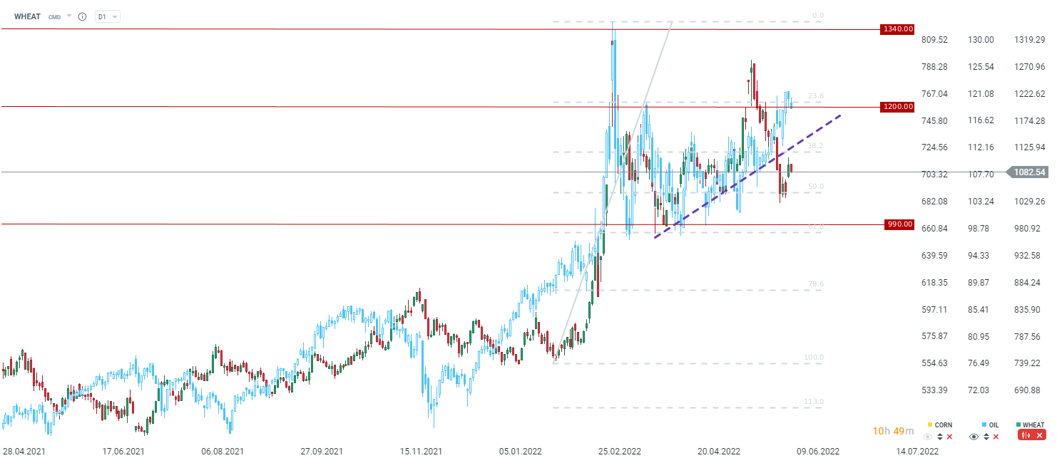 WHEAT continua ad aggirarsi al di sotto della linea di tendenza al rialzo. Le previsioni ufficiali sui prezzi del governo statunitense per quest'anno rimangono vicine agli attuali prezzi di mercato. Fonte: xStation5