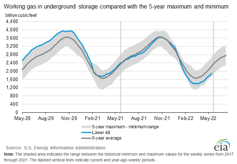 - Le scorte di gas naturale non vengono riempite abbastanza rapidamente per tornare alla media di 5 anni. Le scorte erano vicine alla media di 5 anni l'anno scorso