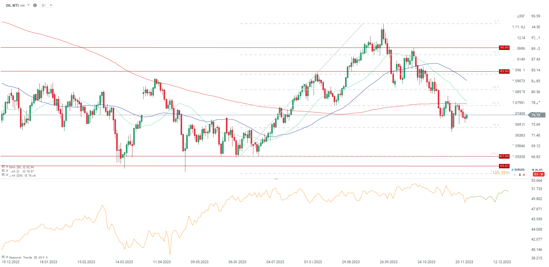 Il WTI (OIL.WTI) è risalito sopra i 75 dollari al barile. È un livello chiave da tenere d’occhio questa settimana. Allo stesso tempo, sembra che la media mobile a 200 periodi e il 61,8% del ritracciamento potrebbero fungere da limite per i prezzi del petrolio nelle prossime settimane. I modelli di stagionalità suggeriscono una performance mista dei prezzi del petrolio nelle prossime due settimane. Fonte: xStation5