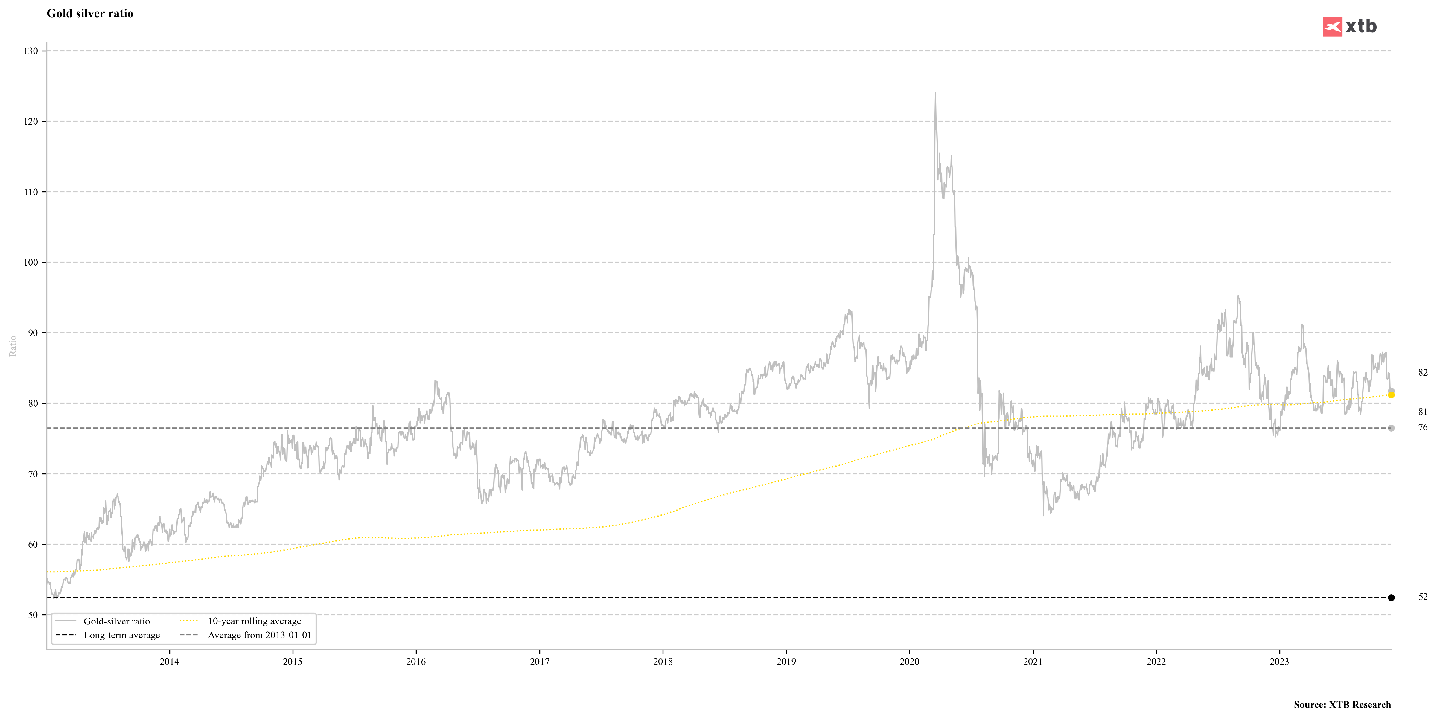 Il rapporto oro/argento è diminuito in modo significativo, il che suggerisce che una nuova tendenza potrebbe essere sul punto di iniziare. Sembra che il rapporto possa scendere a 76,00, il che con un prezzo dell'oro a circa $ 2.000 l'oncia si traduce in un prezzo dell'argento superiore a $ 26,00 l'oncia. Fonte: Bloomberg Finance LP, XTB
