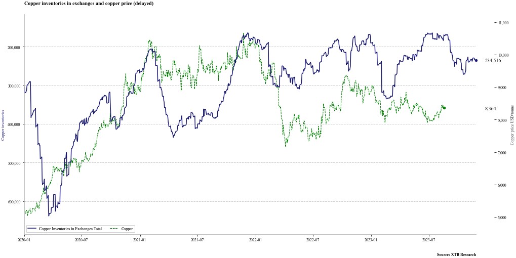 I dati sulle scorte (principali) suggeriscono che il rame potrebbe presto iniziare a essere sotto pressione. D’altro canto, i livelli delle scorte si sono recentemente stabilizzati. Fonte: Bloomberg Finance LP, XTB