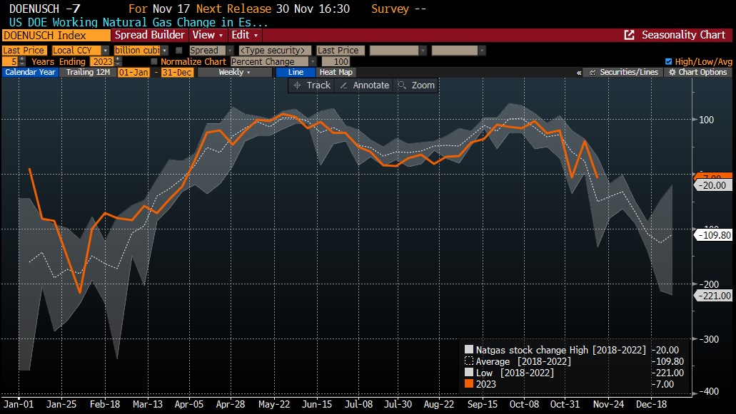 Il calo delle scorte di gas naturale della scorsa settimana è stato inferiore a quanto suggerito dalla media quinquennale del periodo. Fonte: Bloomberg Finance LP