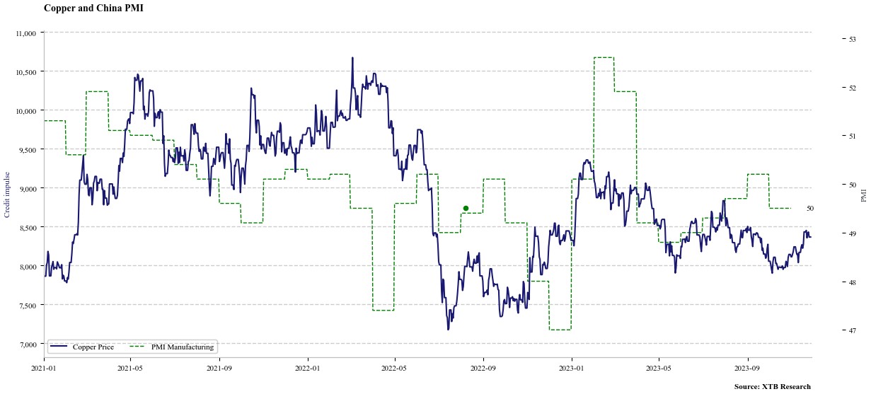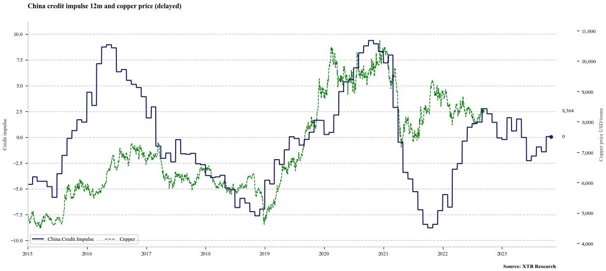 L’impulso al credito cinese suggerisce anche la possibilità di un prossimo calo dei prezzi del rame. Fonte: Bloomberg Finance LP, XTB
