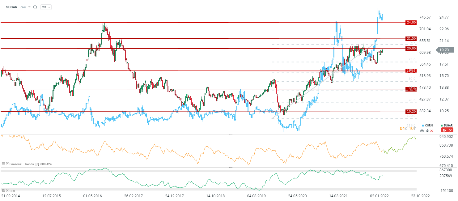In caso di rottura forte e decisa sopra l'area di 20.00, il movimento al rialzo dello zucchero potrebbe estendersi verso 21.50 o addirittura 24.00. Fonte: xStation5