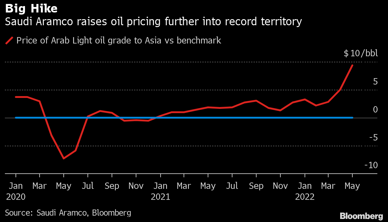Saudi Aramco ha annunciato prezzi all'esportazione record per i clienti asiatici. Il grafico mostra il premio pagato rispetto al benchmark Brent. Fonte: Bloomberg