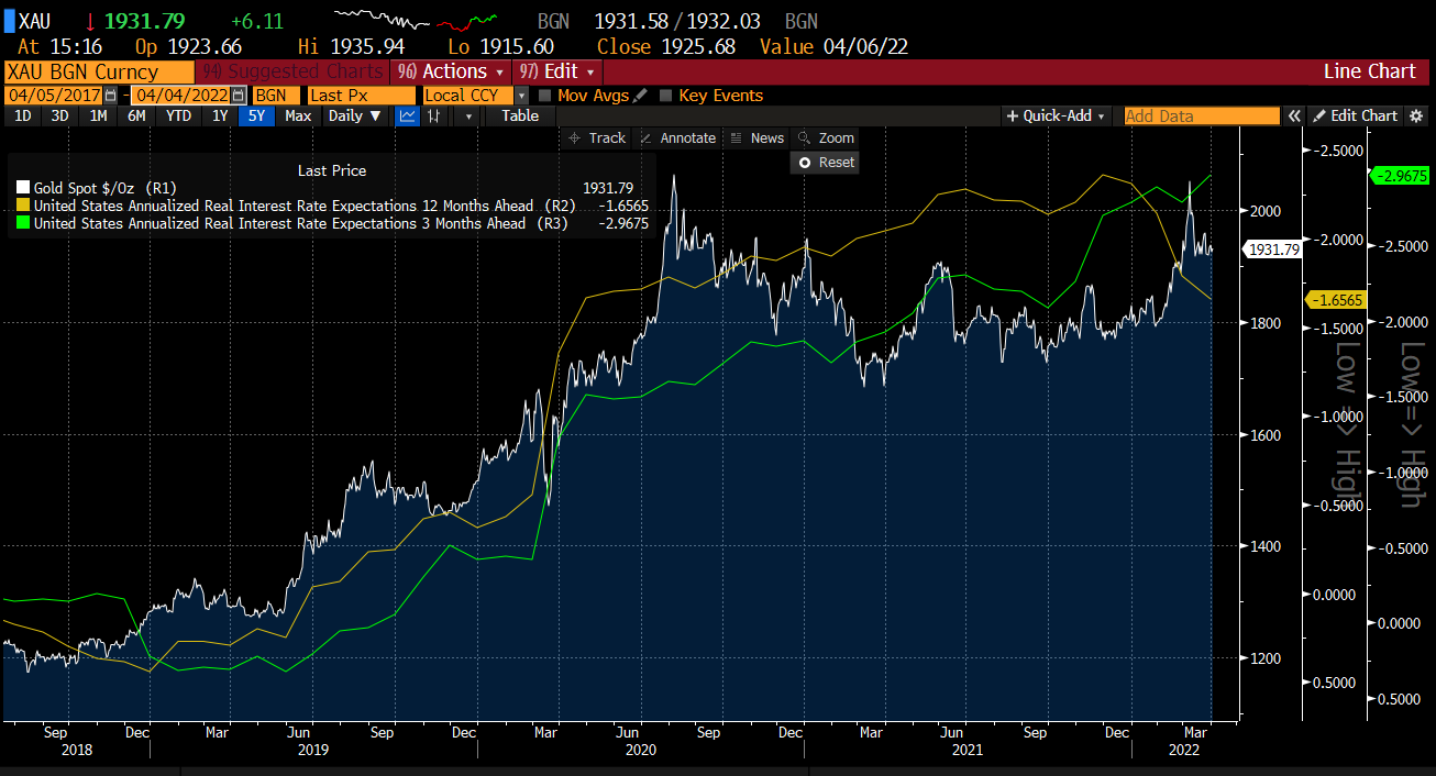 - D'altra parte, le aspettative sui tassi di interesse reali statunitensi a lungo termine continuano a diminuire e attualmente si attestano intorno al -3%. Dato che la Fed dovrebbe aumentare i tassi di circa 100 punti base fino alla metà del 2022 e che l'inflazione negli Stati Uniti continua ad aumentare, vi sono validi motivi per un ulteriore calo delle aspettative sui tassi reali
