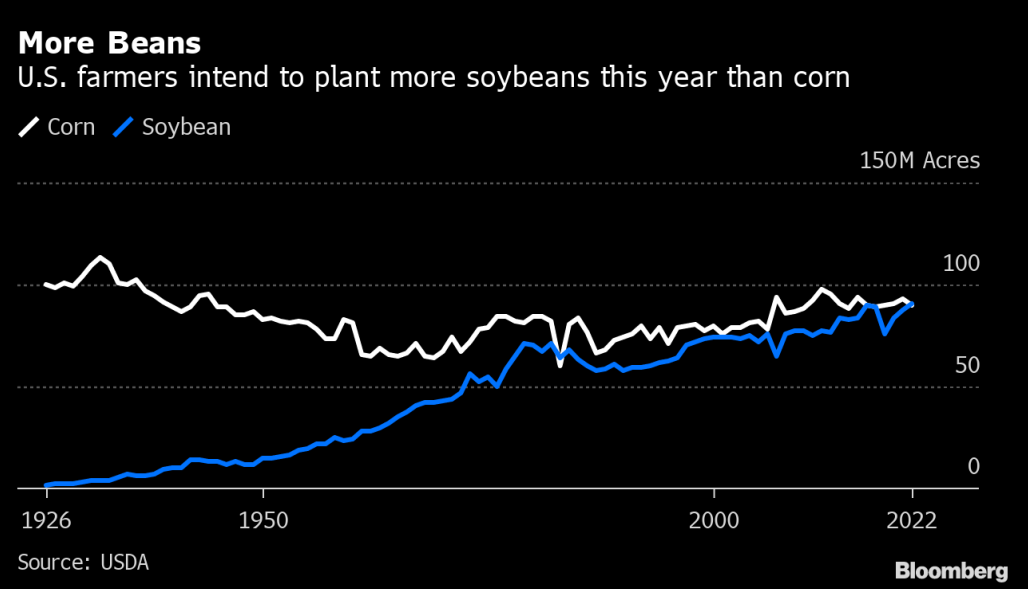 Gli agricoltori statunitensi pianificano di piantare meno mais che soia. Se confermata, sarebbe la terza situazione del genere nella storia dopo il 1983 e il 2018. Il governo degli Stati Uniti ha incoraggiato gli agricoltori a ridurre la superficie coltivata nel 1983 per sostenere i prezzi bassi mentre il 2018 ha visto la guerra commerciale USA-Cina. Fonte: Bloomberg